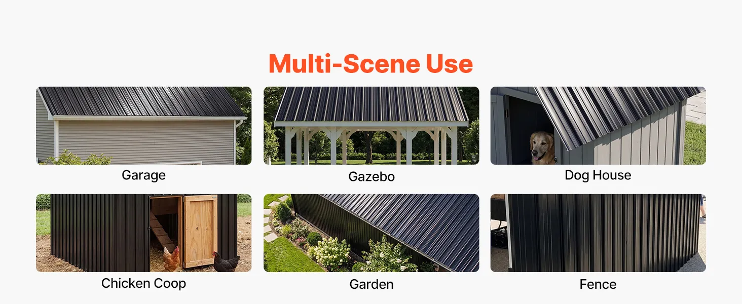 Versatile Applications: Ideal for carports, tool sheds, warehouses, chicken coops, dog houses, fences, and more, these metal roof panels are suitable for a wide range of outdoor roofing and wall applications