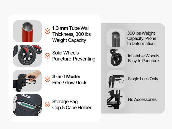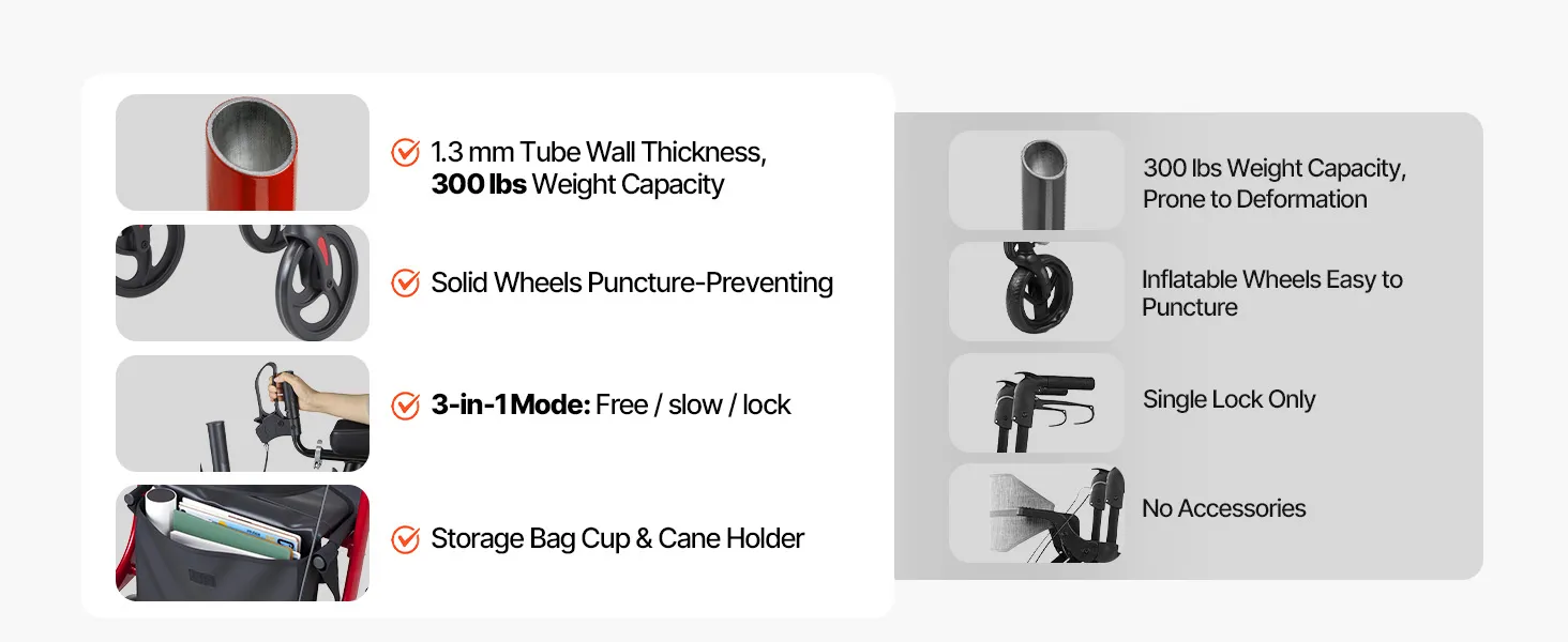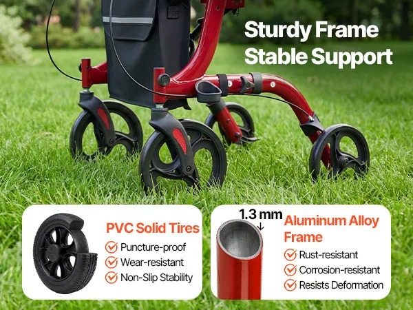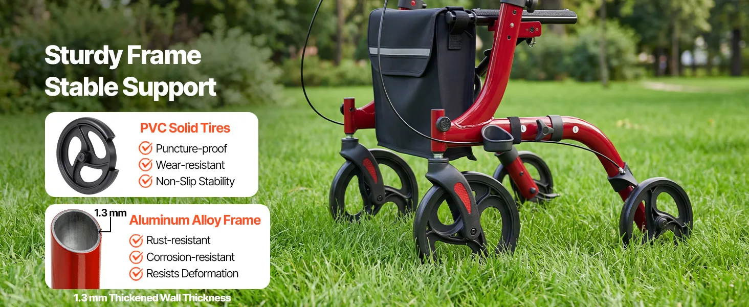 Strong Frame, Reliable Support: Built with a 1.3mm thickened aluminum alloy frame, this VEVOR rollator walker for seniors supports up to 300 lbs. Lightweight yet strong structure is more portable than steel frames while providing stable support for indoor and outdoor mobility