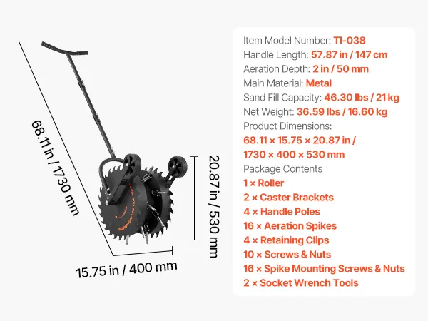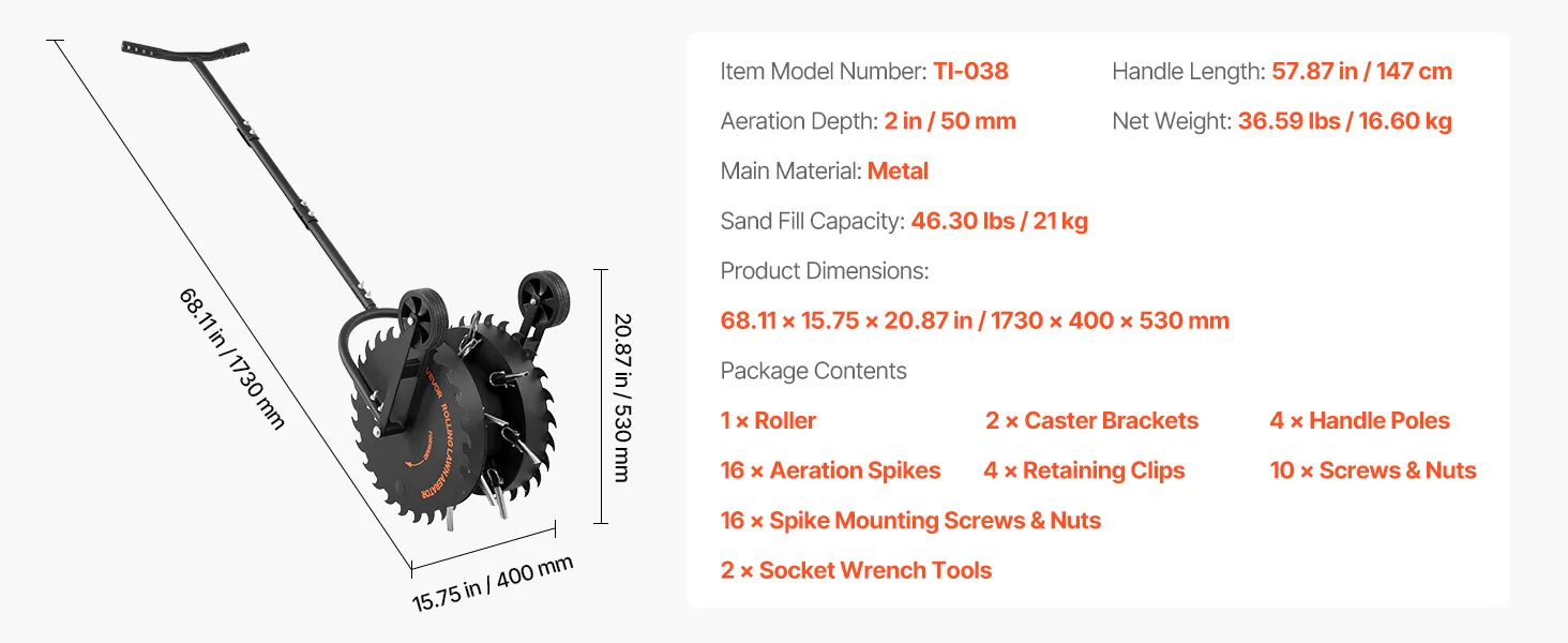 Heavy-Duty Construction: Built entirely from heavy-gauge steel, the drum features a 2.0 mm wall thickness for superior rigidity and resistance to deformation. This rolling lawn aerator comes with powder-coated finish against rust, rain, wet soil, and fertilizer corrosion, ensuring durability