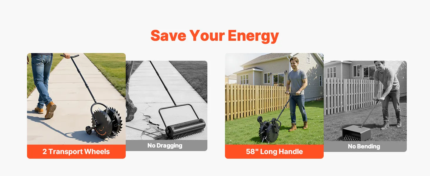 58-Inch Handle: No Bending Required: The extended 58-inch handle allows most adults to work without bending over. Made from 1.5 mm thick steel tubing, the manual aeration tool provides strength while using leverage to reduce effort, helping protect your back and waist during extended use