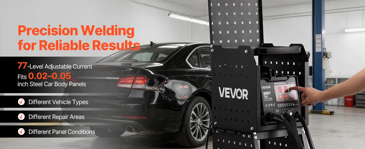 Easy to Operate: Features 7 welding modes and a user-friendly control panel for simple operation. Combined with 77-level current adjustment for precise control, it is suitable for 0.02"–0.05" steel auto body panels, reducing the risk of burn-through and weak welds