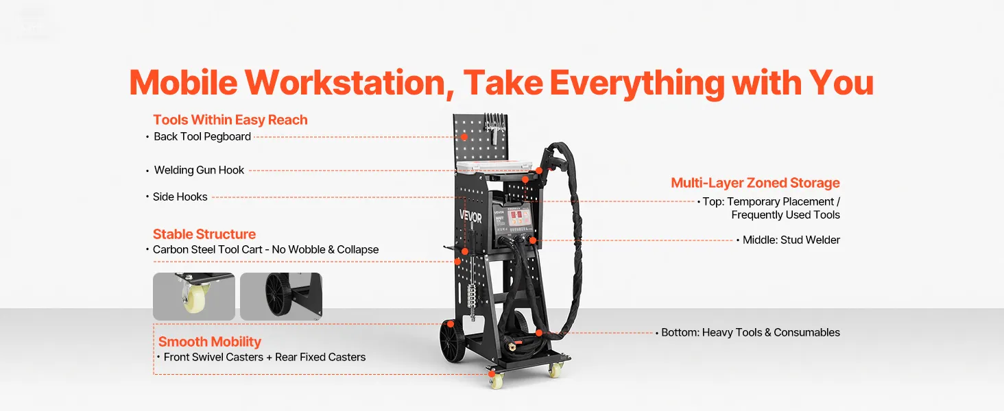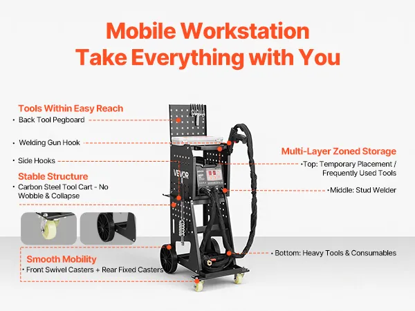 Flexible Storage & Easy Mobility: Loaded on a smooth-rolling cart with side hangers, a backboard, and top hooks to keep tools within easy reach. 3-tier storage keeps equipment neatly organized, and effortless mobility around the workshop greatly improves efficiency