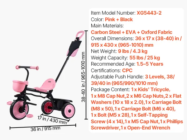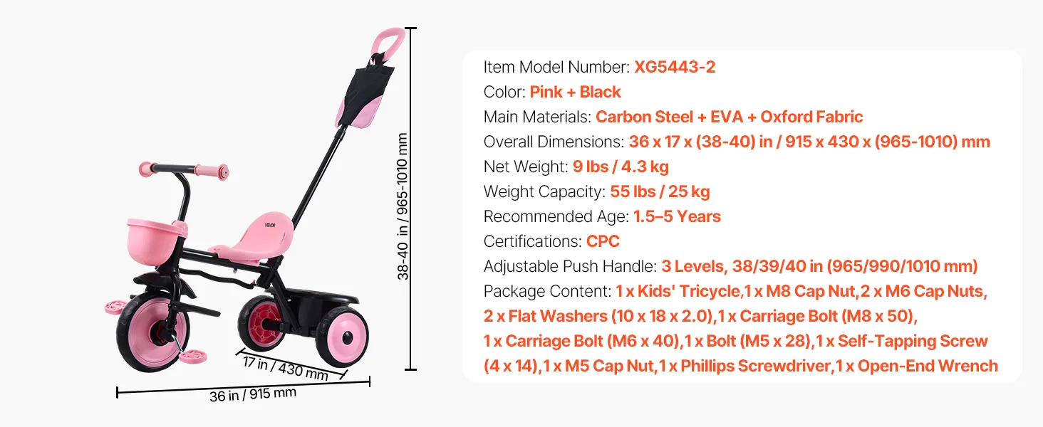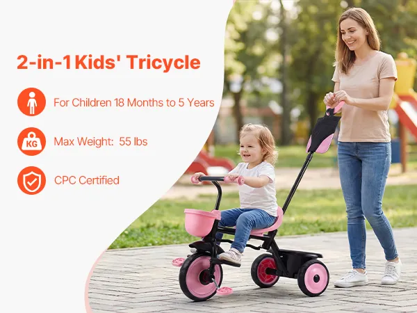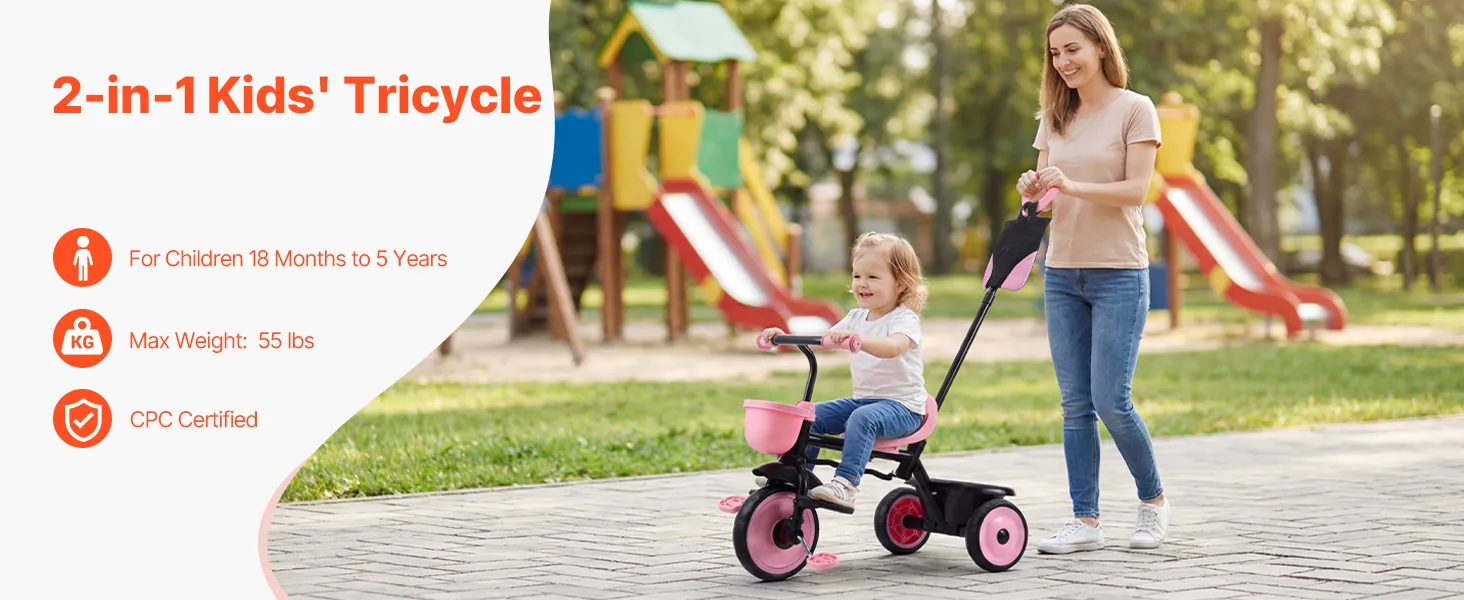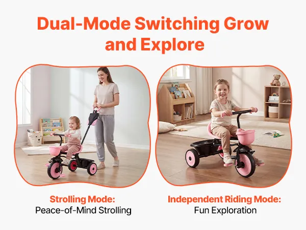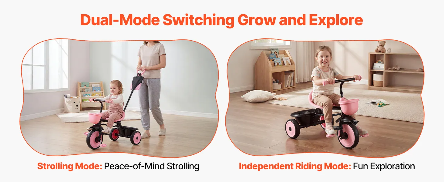 Dual-Mode Convertible: Designed for children aged 18 months to 5 years old. Effortlessly switches between stroller and tricycle with simple assembly, supporting parent-push strolling to independent riding for all growth stages