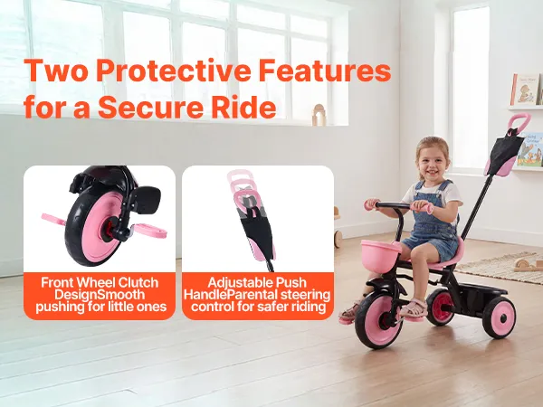 Stable Structure: Triangular stable frame & widened EVA wheels structurally reduce rollover risks. Front-wheel clutch and adjustable push handlebar, maximize protecting your little one
