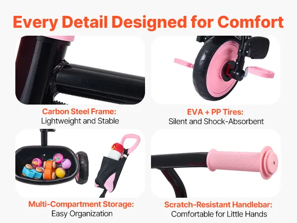 The EVA+PP wheels help reduce noise and absorb vibrations during riding. In addition, the toddler trike is equipped with a storage basket and cup holder for carrying small items.