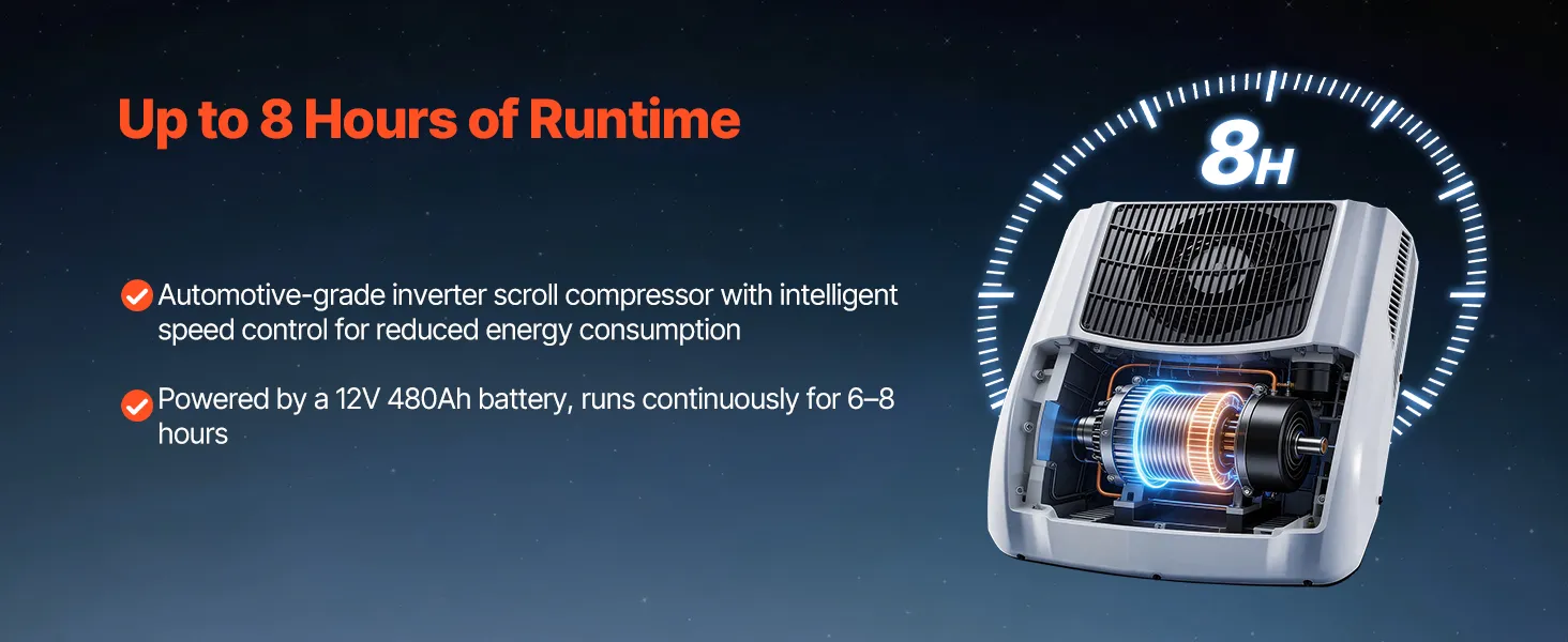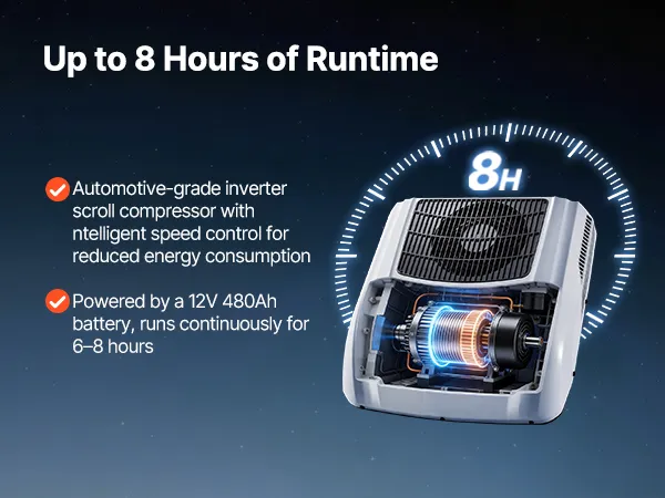 Energy Efficient: Our truck AC unit uses automotive-grade inverter technology for improved efficiency. The smart variable-frequency scroll compressor automatically adjusts speed to reduce power consumption. It can run for 6–8 hours on a 12V battery