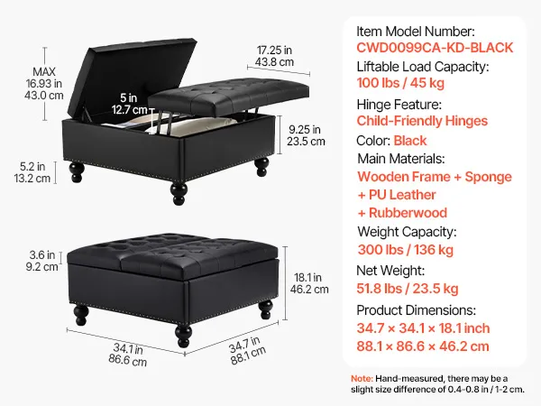 Cozy Feel, Strong Build: Built with solid wood and filled with high-density foam, this leather square ottoman with storage delivers both comfort and support. The leather top wipes clean easily, letting you enjoy drinks or snacks without stress. Holds up to 300 lbs with ease