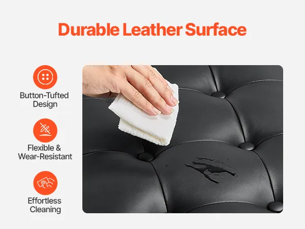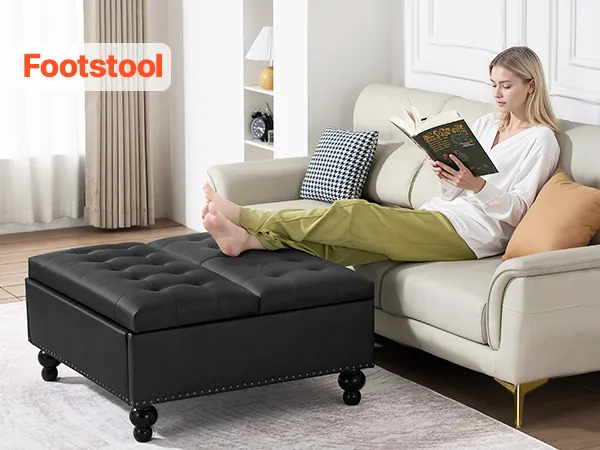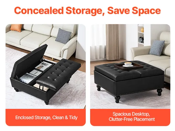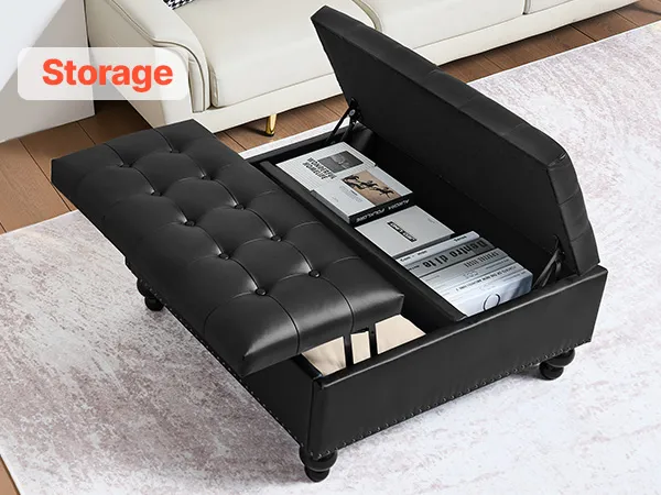 All-in-One Storage Ottoman: Combining classic tufted design with everyday function, this leather ottoman coffee table stores your essentials while doubling as a coffee table, office bench, or footrest. It's your go-to for comfort, storage, and style in any room