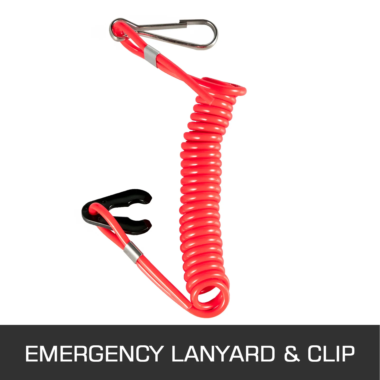 【SAFETY LANYARD】- The cord can secure the operation by being attached to the operator's clothing, or arm, or leg. Should operators fall or leave the helm, the cord will pull out the clip, stopping ignition.