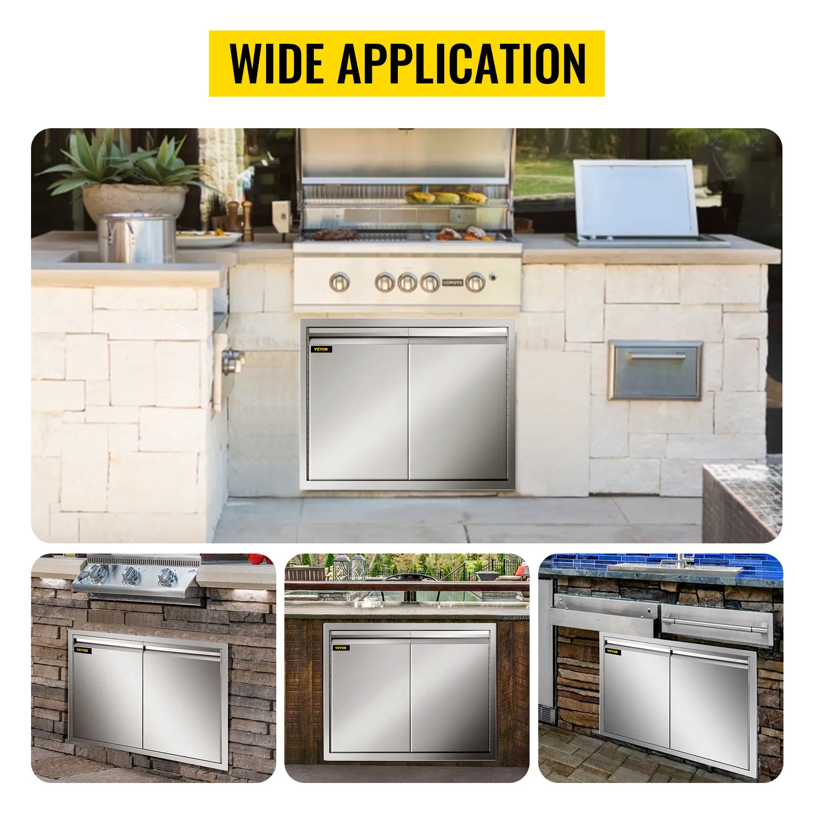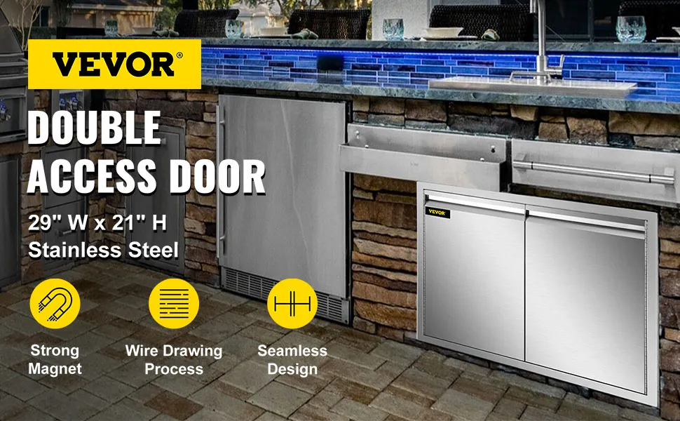 Our 29" x 21"/73.6 x 53 cm outdoor kitchen doors are made of stainless steel, rust- and corrosion-proof for a long service time. The seamless design blocks dust/rainwater and round corners ensure secure use.