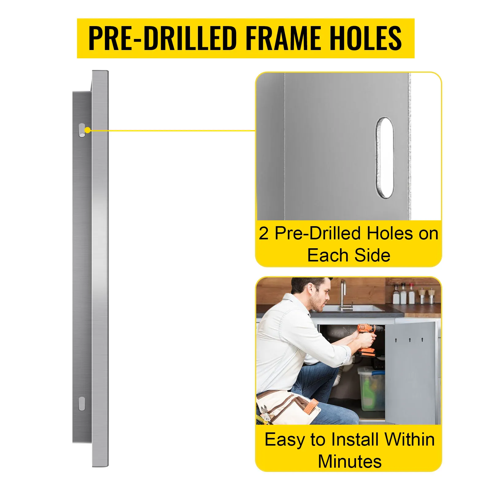 Hassle-Free Installation: With pre-drilled holes on the frame, our outdoor kitchen cabinet doors can be easily installed within minutes into any wall in a flush mount style. You don't need to worry about punching holes in the steel plate any longer. So get ready to use the exquisite doors the day you receive our package and experience a superior modern life quality.