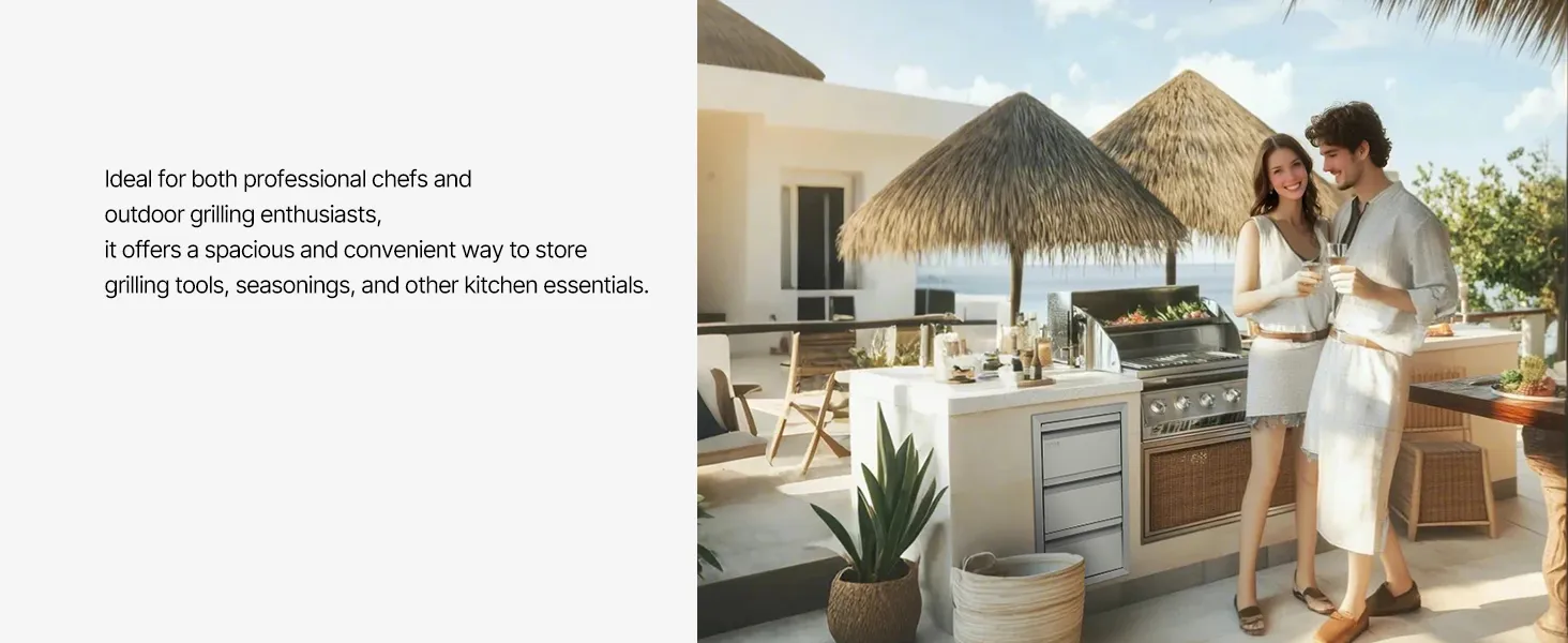 Wide Application: These outdoor storage drawers are ideal for indoor and outdoor kitchens, particularly BBQ islands. They have ample space to store various kitchen utensils such as dishes, forks, and spoons. Moreover, they are weather-resistant and can withstand harsh weather conditions, including wind and rain.