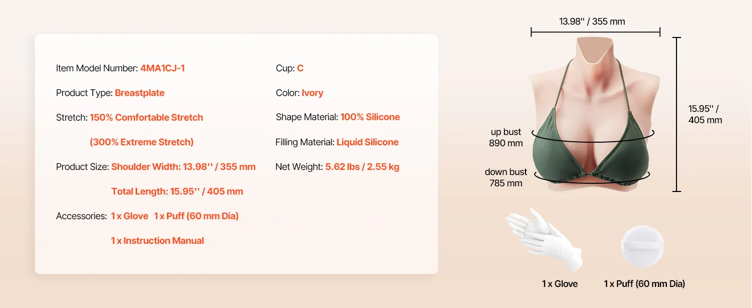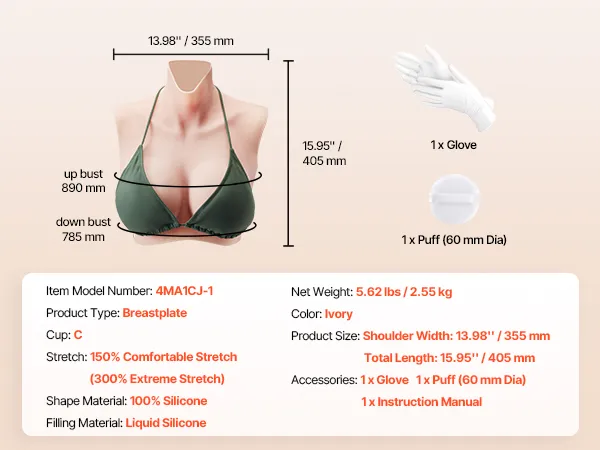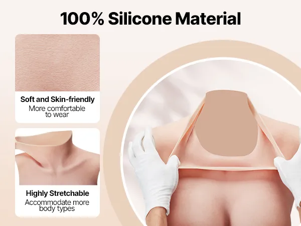 Soft and Skin-Friendly: Our C-Cup silicone breastplate is made from 100% silicone, offering a soft touch and comfortable wear. It provides excellent stretching capacity, capable of extending 150%-300% of its original size. (Suitable Height: 63 - 71 inch / 160 - 180 cm ; Suitable Weight: 132 - 187 lbs / 60 - 85 kg)