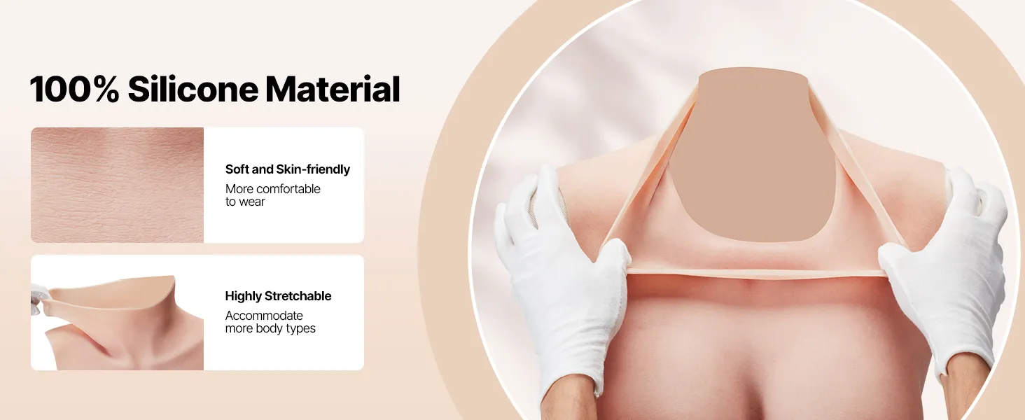 This 100% silicone breastplate is soft and skin-friendly, providing an unparalleled wearing experience. Its excellent stretchability allows the breastplate to accommodate a variety of body types, offering a more comfortable fit and showcasing a natural, realistic appearance.