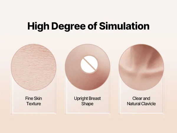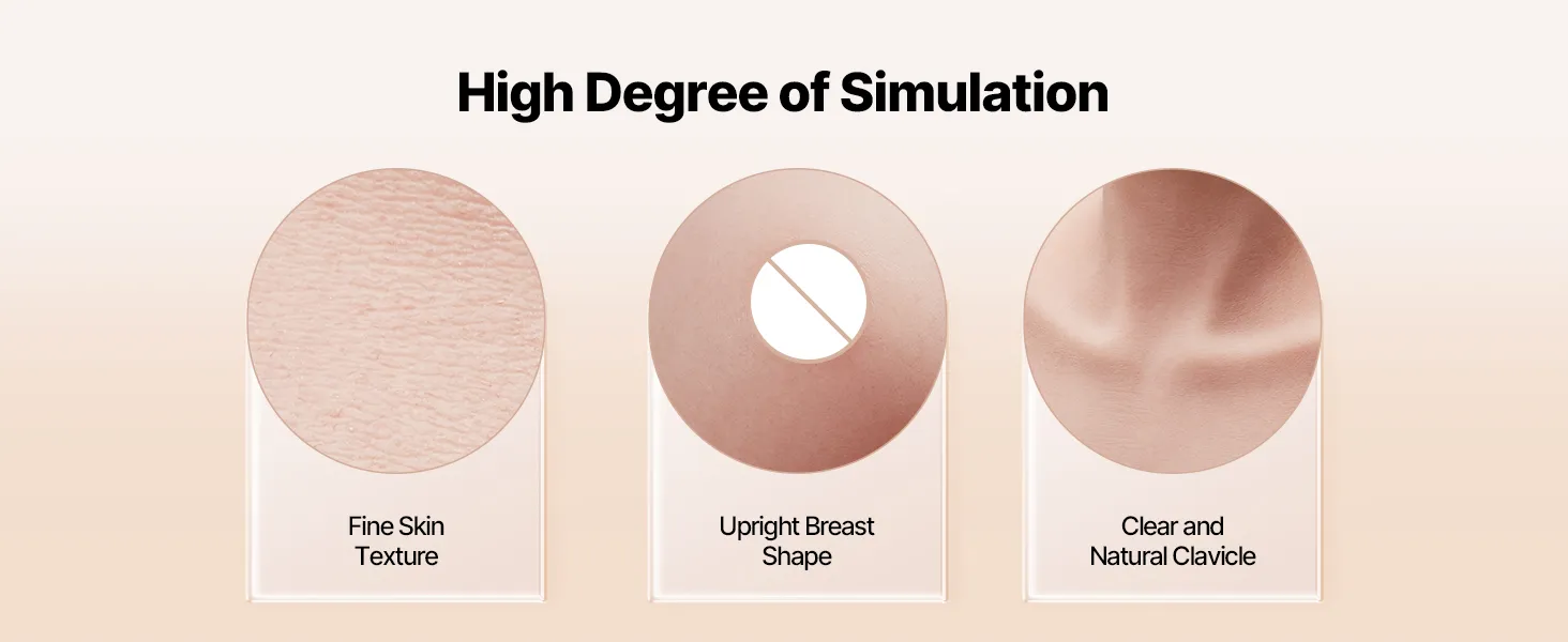 Realistic and Natural: High degree of simulation design, with fine skin texture, provides a realistic appearance. The upright breast shape, clear clavicular line, realistic pores, and blood vessels restore every detail, resulting in a natural appearance.