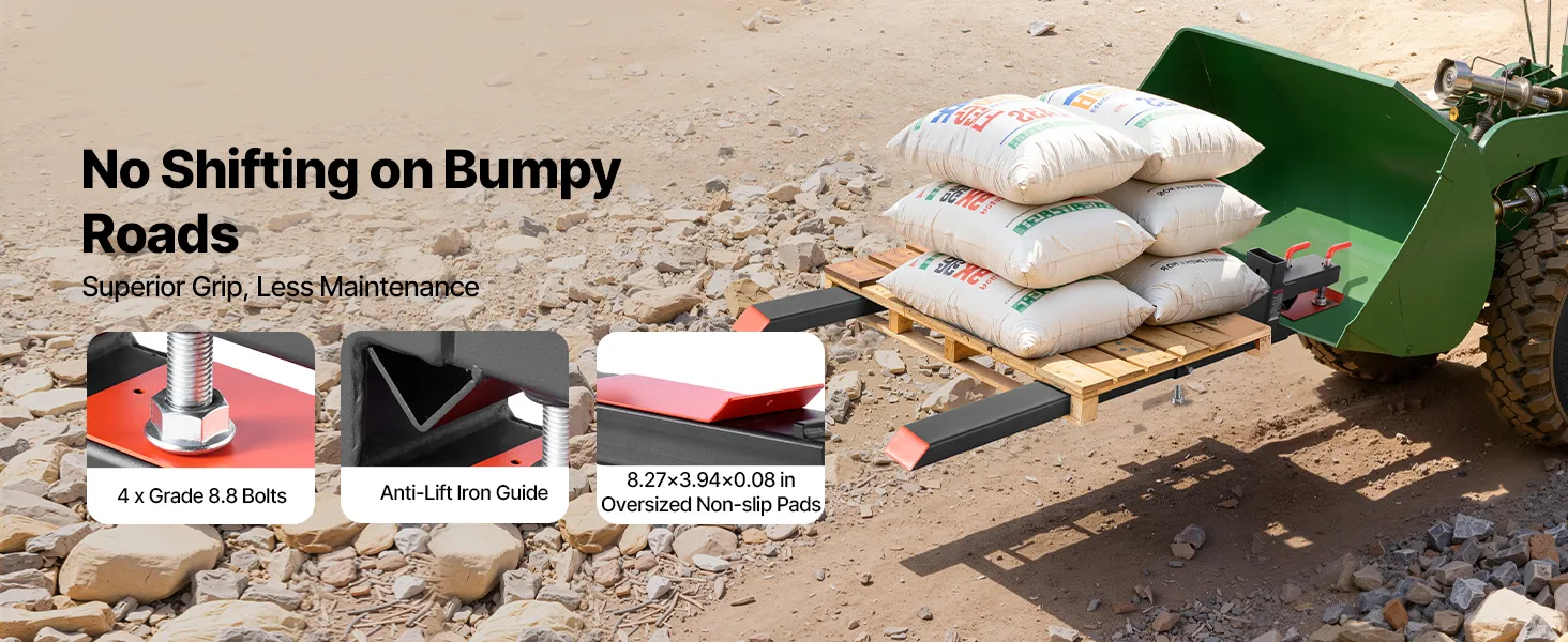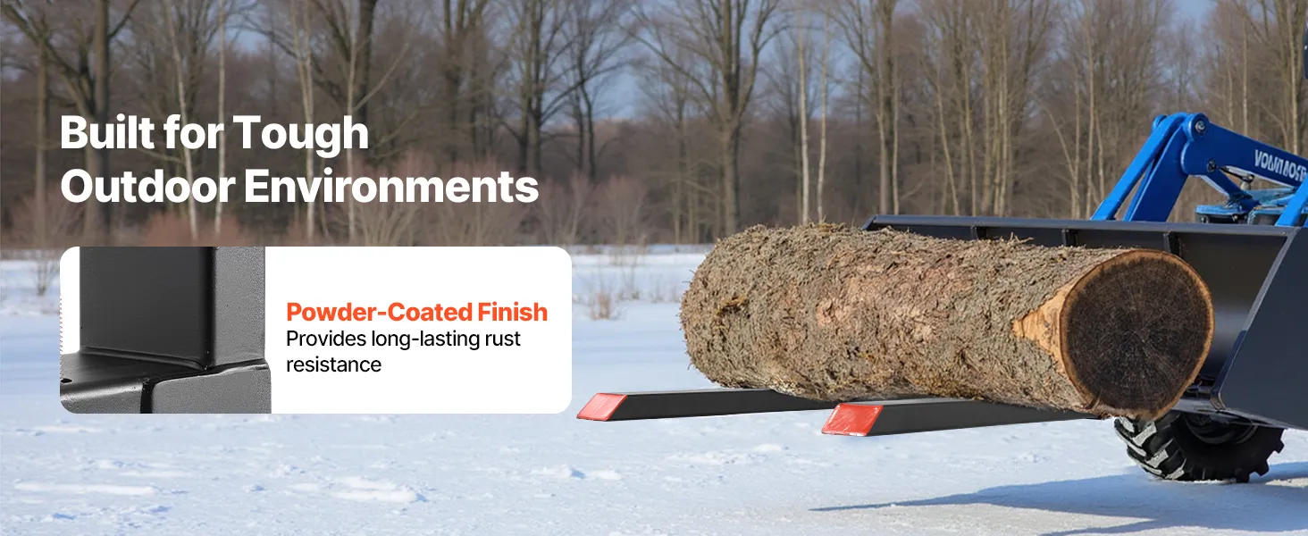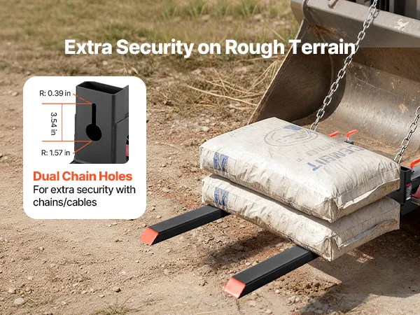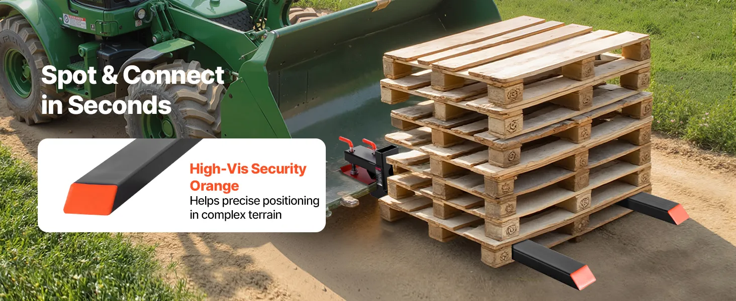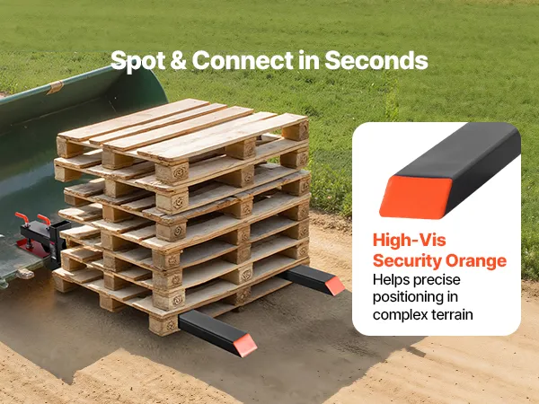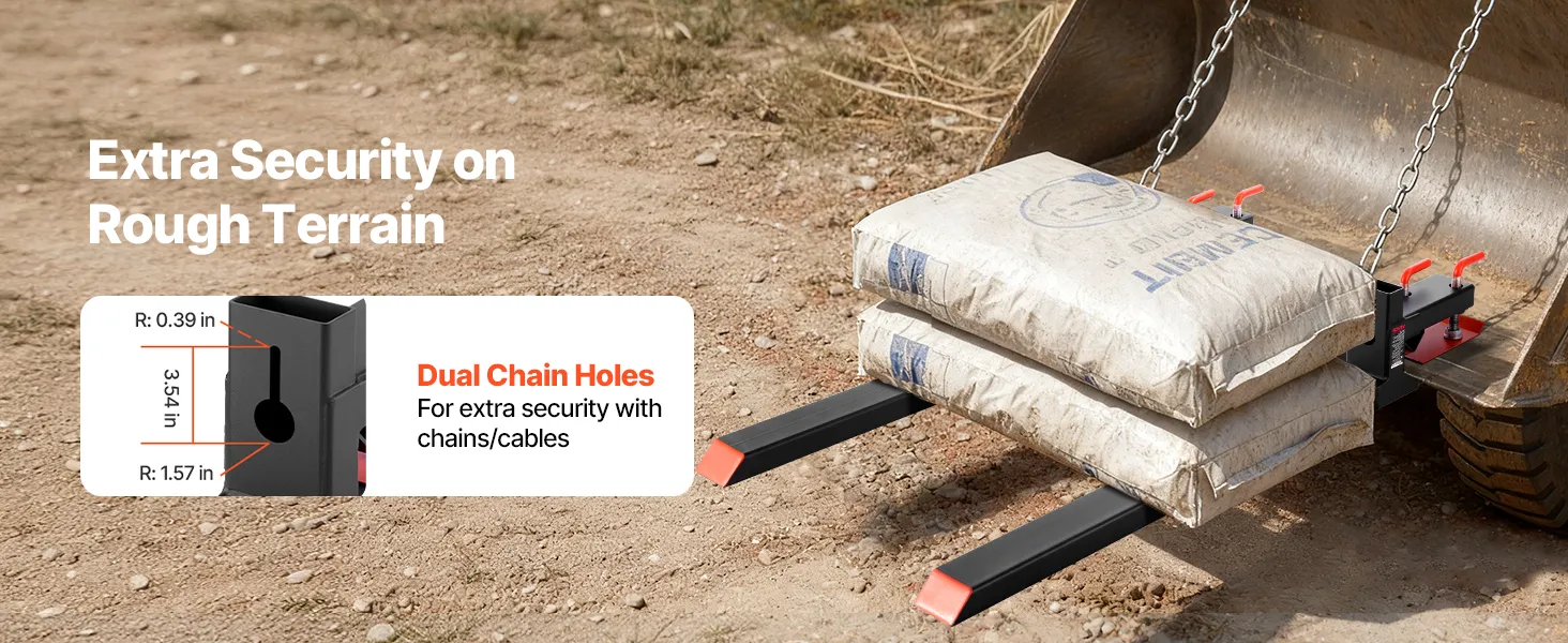 Quality Details: Q235B steel and a powder-coated finish of our pallet forks stand up to tough outdoor use. Dual chain holes support extra tie-downs, while bright orange tips boost visibility