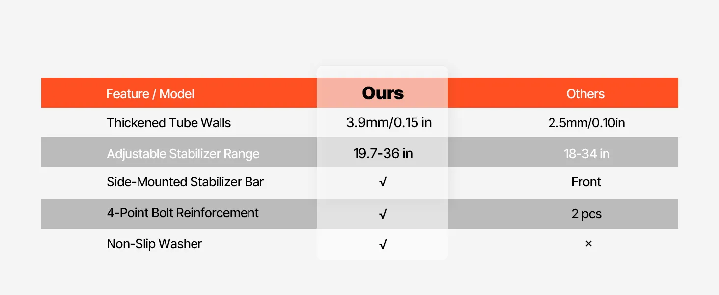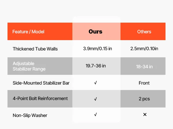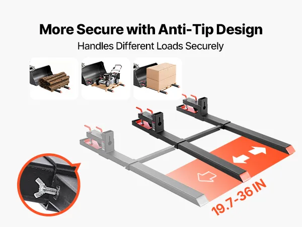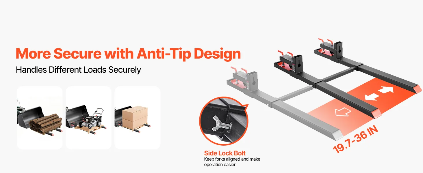 Adjustable Stabilizer Bar: The 19.7–36 in (500–915 mm) adjustable range of the tractor forks keeps forks aligned, avoids load slide, and spreads side pressure for more secure, smoother handling