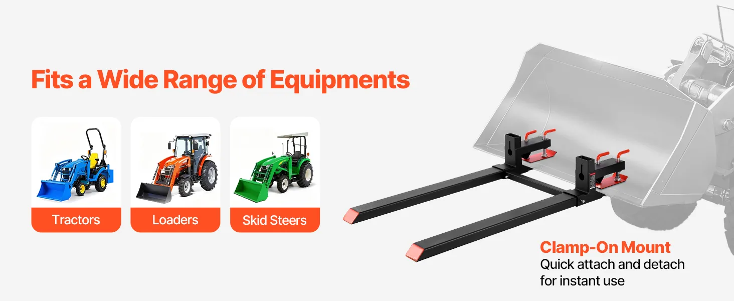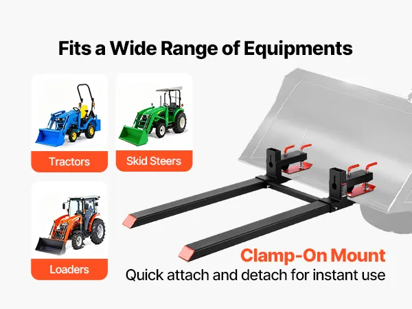 The clamp on pallet forks attach to most tractors, loaders, and skid steers with simple clamps. You skip buying a dedicated forklift, boost handling efficiency, and keep jobs moving securely.