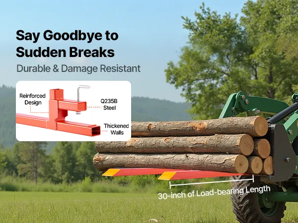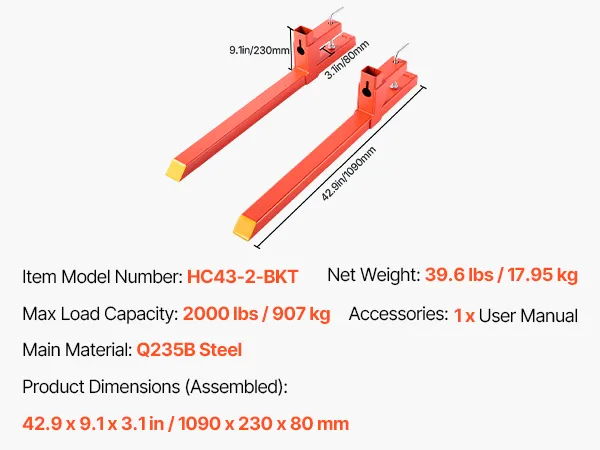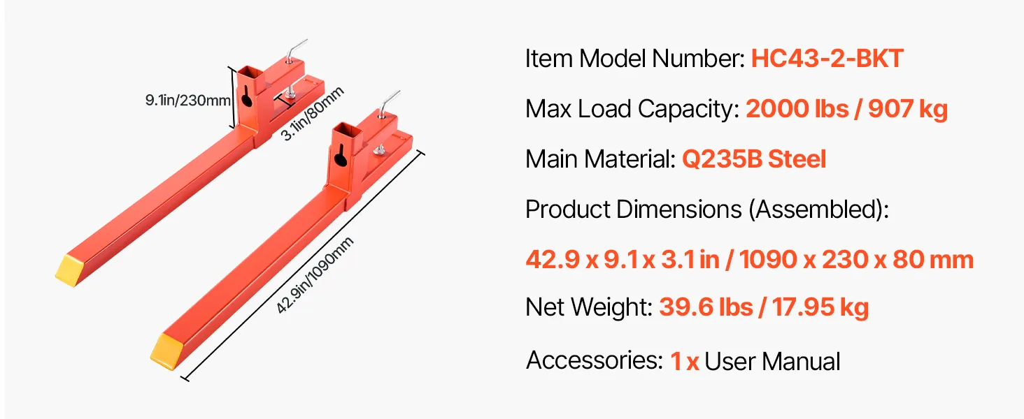Secure Load Capacity: These 43-inch clamp on pallet forks lift up to 2,000 lbs (207 kg). The 3 mm thick tube walls and side reinforcement ribs help handle heavy loads without bending
