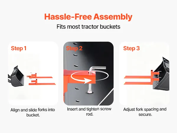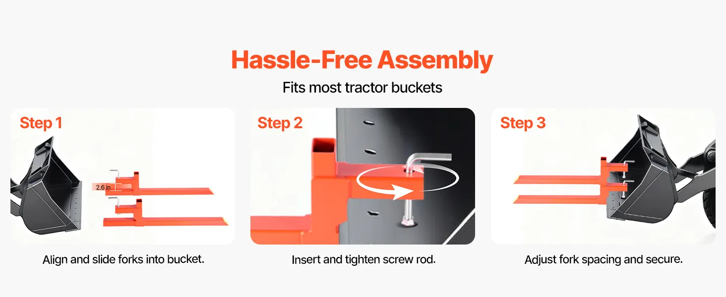 Quick Installation: The clamp-on design of the tractor bucket forks attaches to most tractors, loaders, and skid steers in minutes. You move materials faster without needing a dedicated forklift
