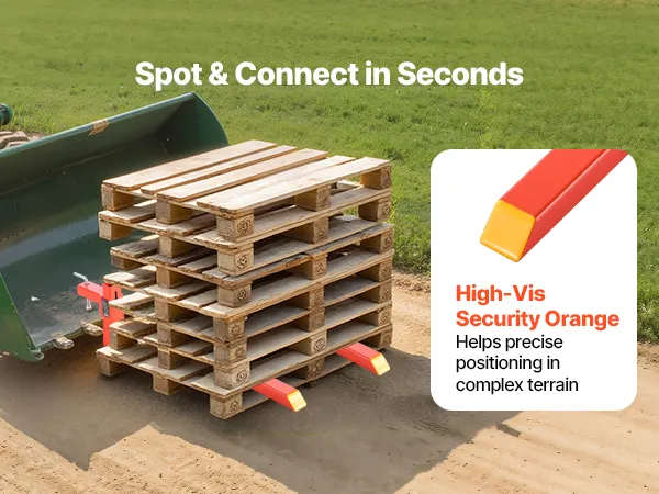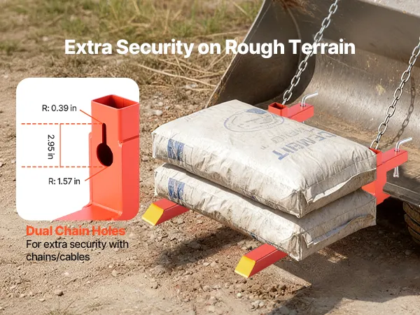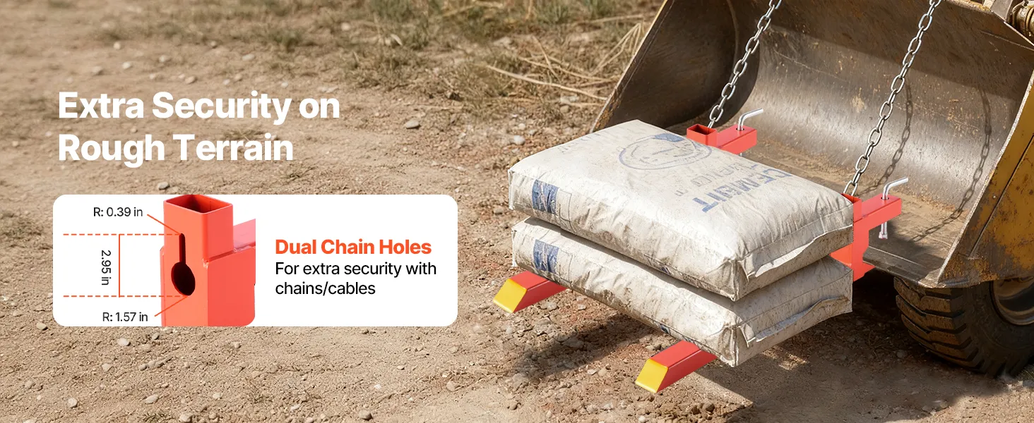 Quality Details: The dual chain holes of our pallet forks support extra tie-downs for added stability, while bright orange tips improve visibility in tricky terrain. You get more secure alignment and smoother handling every time.