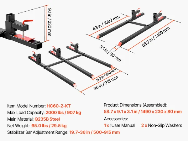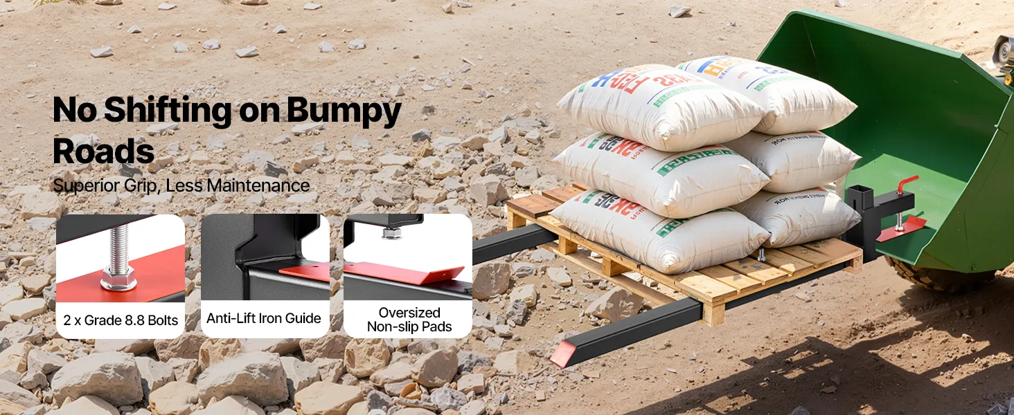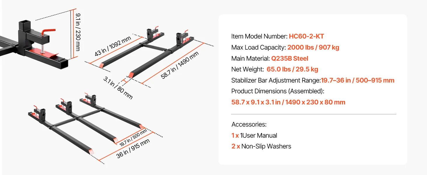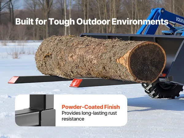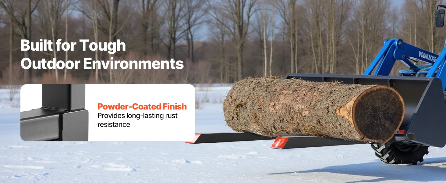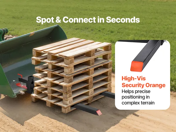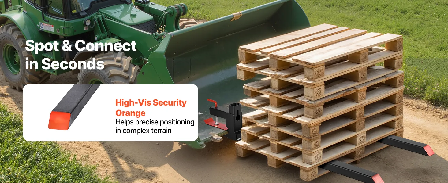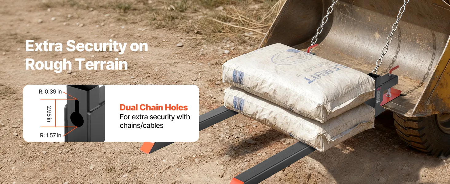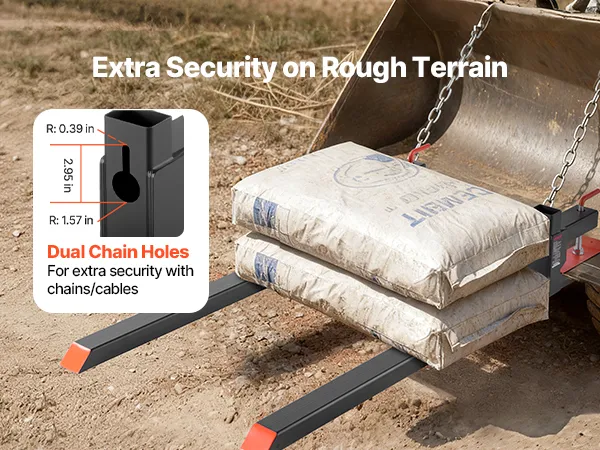 Quality Details: Q235B steel and a powder-coated finish of our pallet forks stand up to tough outdoor use. Dual chain holes support extra tie-downs, while bright orange tips boost visibility