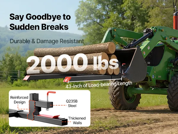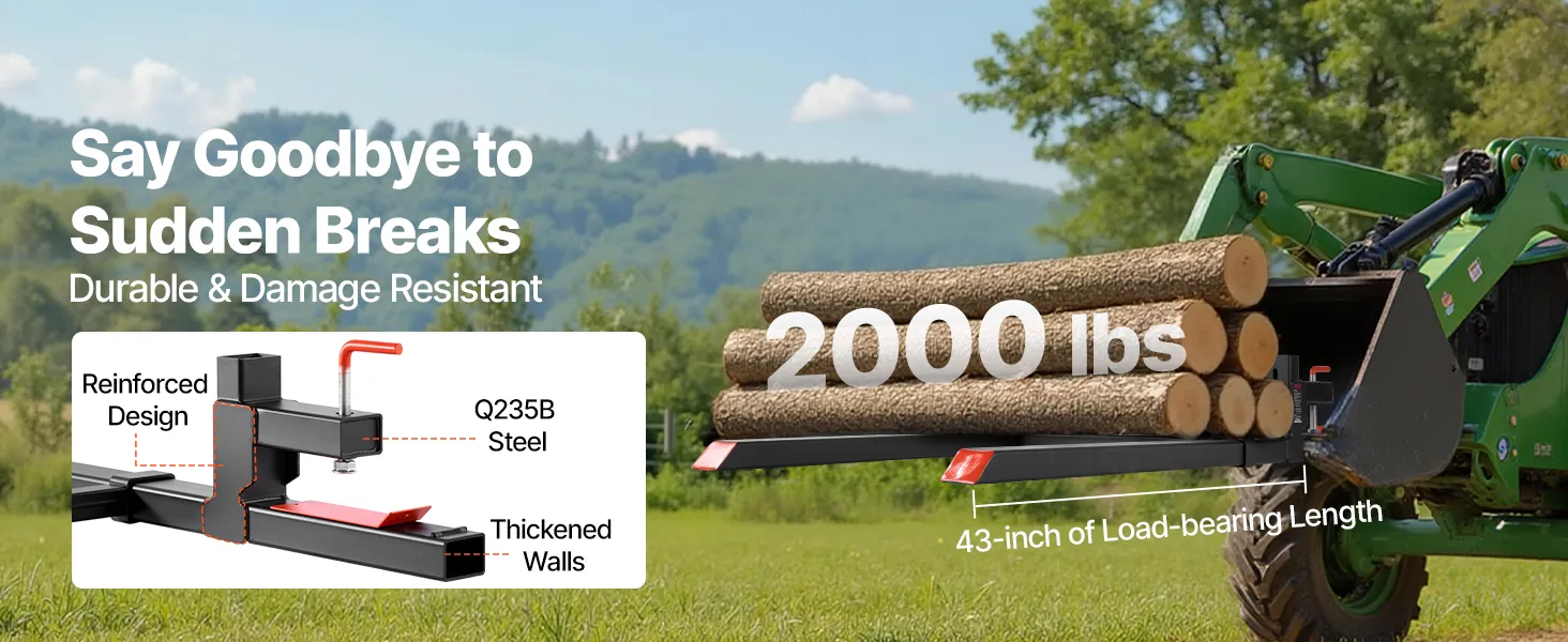 Secure Load Capacity: These 60-inch clamp on pallet forks lift up to 2,000 lbs (907 kg). The 3.8 mm thick tube walls and side reinforcement ribs help handle heavy loads without bending