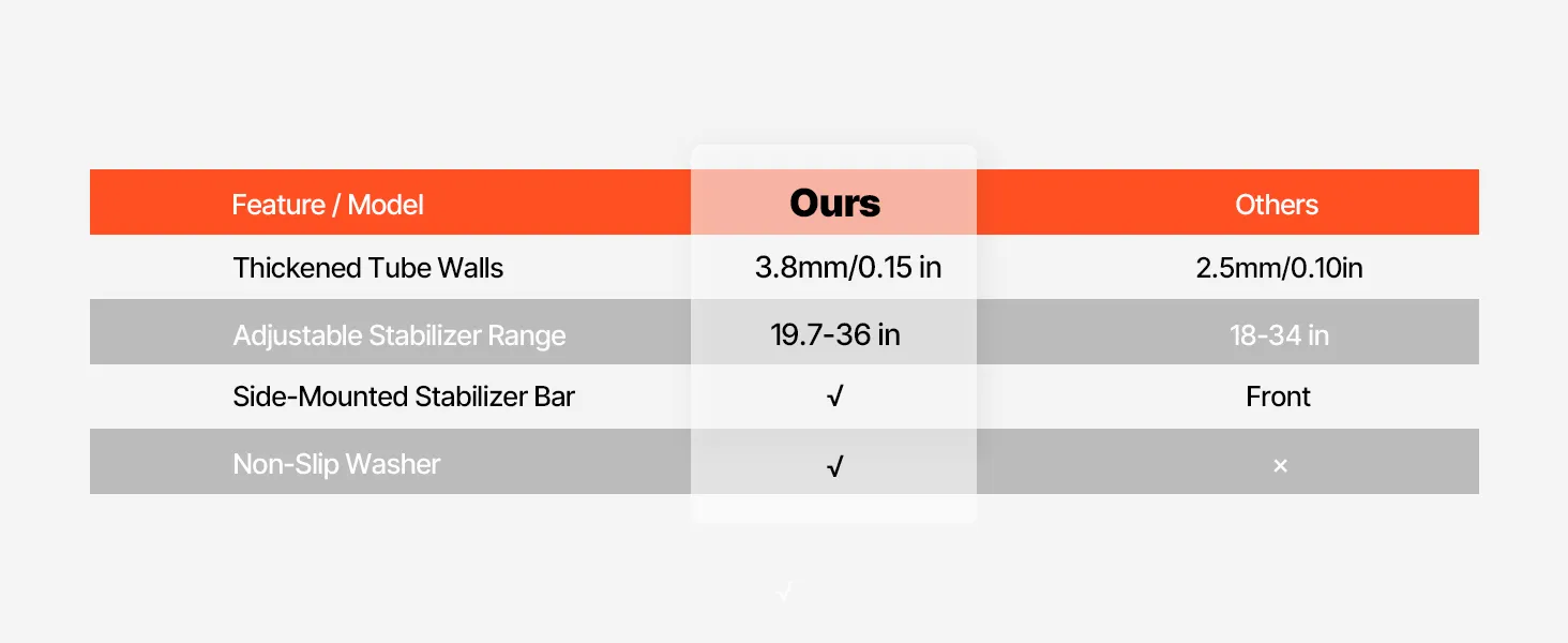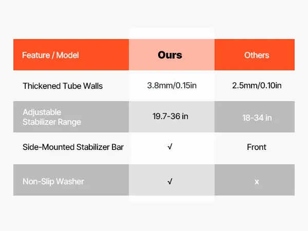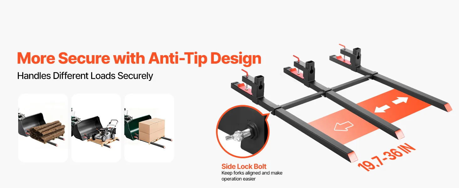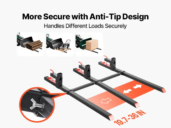Adjustable Stabilizer Bar: The 19.7–36 in (500–915 mm) adjustable range of the tractor forks keeps forks aligned, avoids load slide, and spreads side pressure for more secure, smoother handling