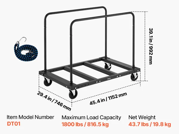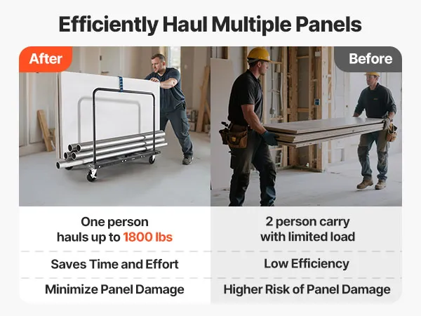 Heavy-Duty Load Capacity: This drywall dolly cart supports up to 1800 lbs. The wide base holds drywall, plywood, stone, or glass with ease, boosting efficiency and saving energy
