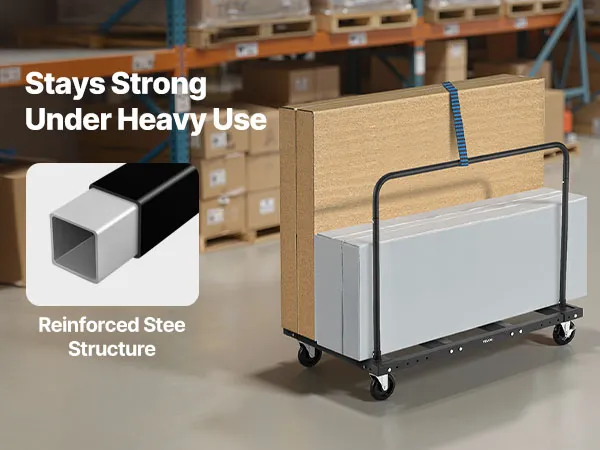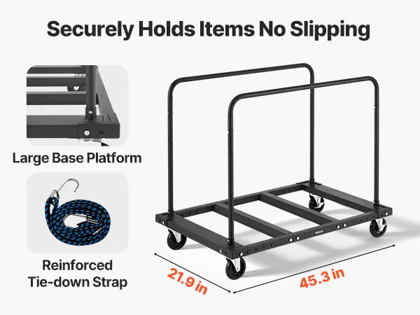 Wide Stable Base: The panel cart measures 45.4 x 29.4 x 39.1 in and weighs 43.7 lbs. A 45.3 x 21.9 in base with a steel handle holds large panels. A 6.6 ft strap adds extra stability