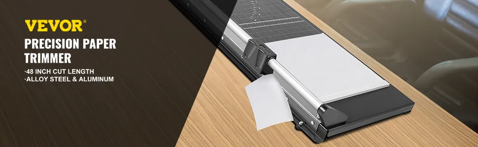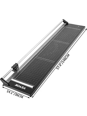 Our straight edge cutter is made of an alloy steel base and aluminum guide rail, with 47.24"/120 cm cutting length and 0.04"/1 mm thickness. The sharp rotary blade and lower blade provide quick and smooth cutting without a rough edge. The paperweight design and measurement grid allow the fast paper cutter to create precise cutting. Paper trimmers and cutters are essential office supplies in photo studios, cultural offices, copying houses, etc.