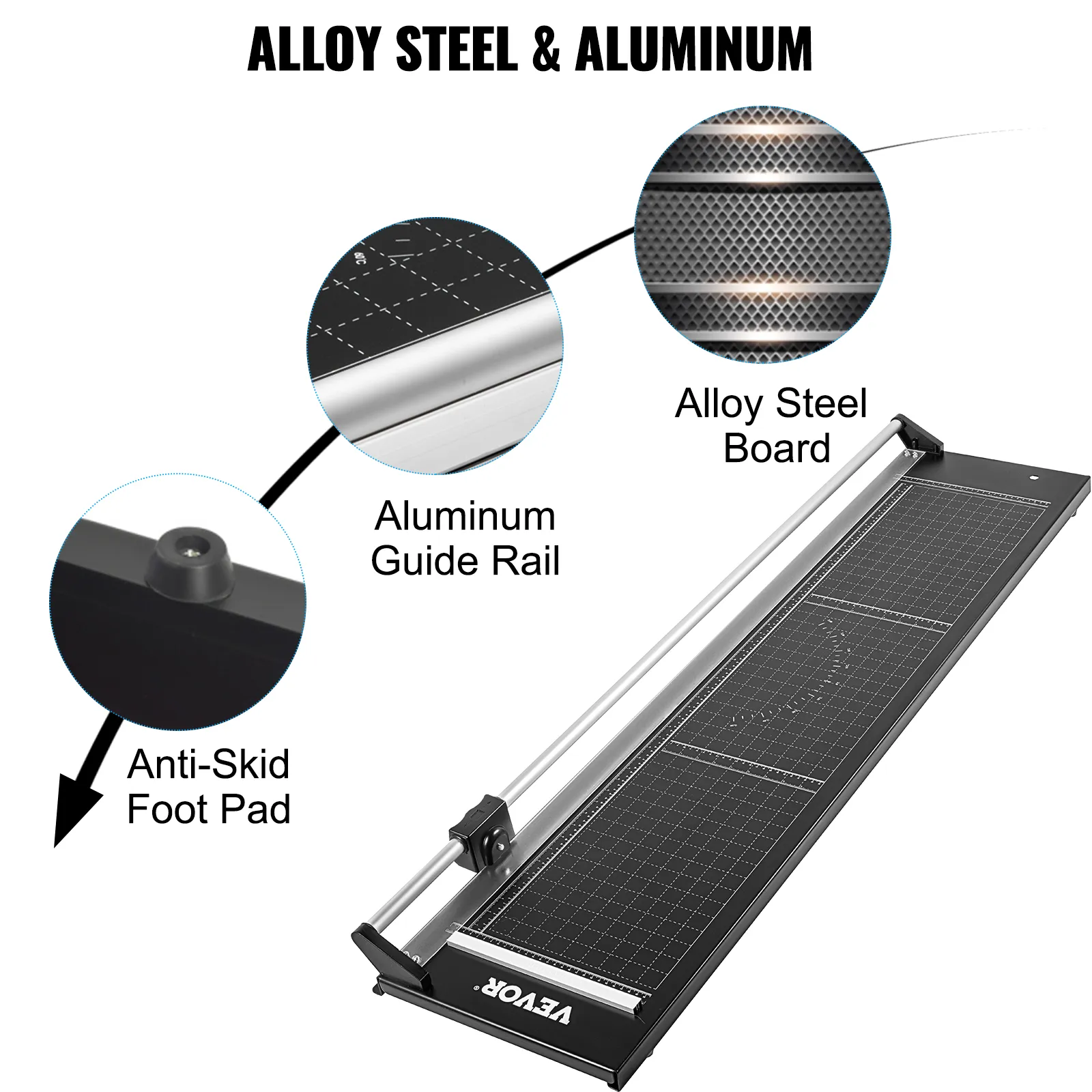 This legal-sized paper cutter is constructed with an alloy steel base and aluminum guide rail, creating high hardness and long service life.