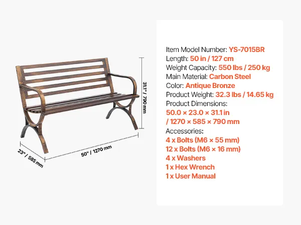 Simple Yet Elegant: The patio bench showcases a simple slatted-pattern backrest with a classic antique bronze finish, adding charm and character to your outdoor seating area. Smooth edges avoid snags and ensure a polished look