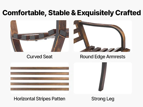 Curved armrests and a contoured seat follow ergonomic design, providing natural comfort for your arms and legs. The backrest of the porch bench leans beyond 90° and features elegant detailing, bringing both comfort and charm.
