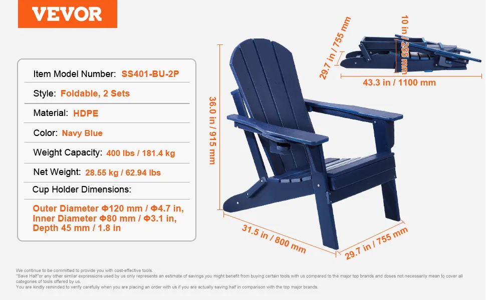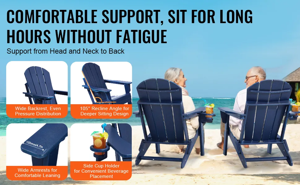 VEVOR Adirondack Chair Plastic, Set of 2 All-Weather Portable Folding Fire Pit Chair, Outdoor Adirondack Patio Chair with Cup Holder, with Relaxing Arm Rest Ergonomic, for Garden, Backyard Navy Blue