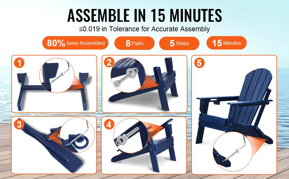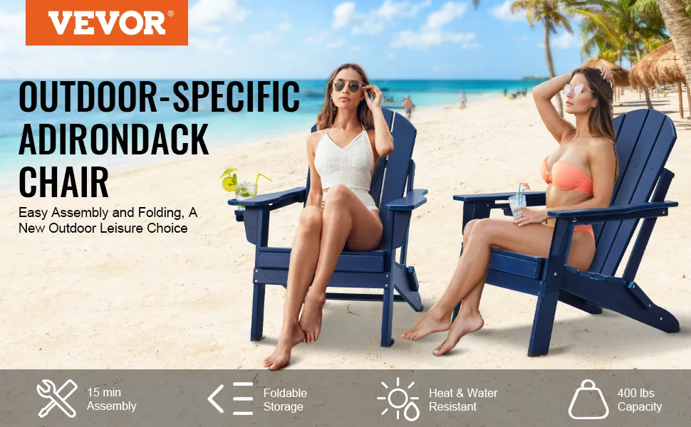 Our Adirondack chair features a foldable design for easy storage. Assembly is quick, taking only 15 minutes with a power screwdriver. Made from HDPE plastic, it supports up to 400 lbs and withstands sun, rain, and wind. Ideal for patios, gardens, and beaches.