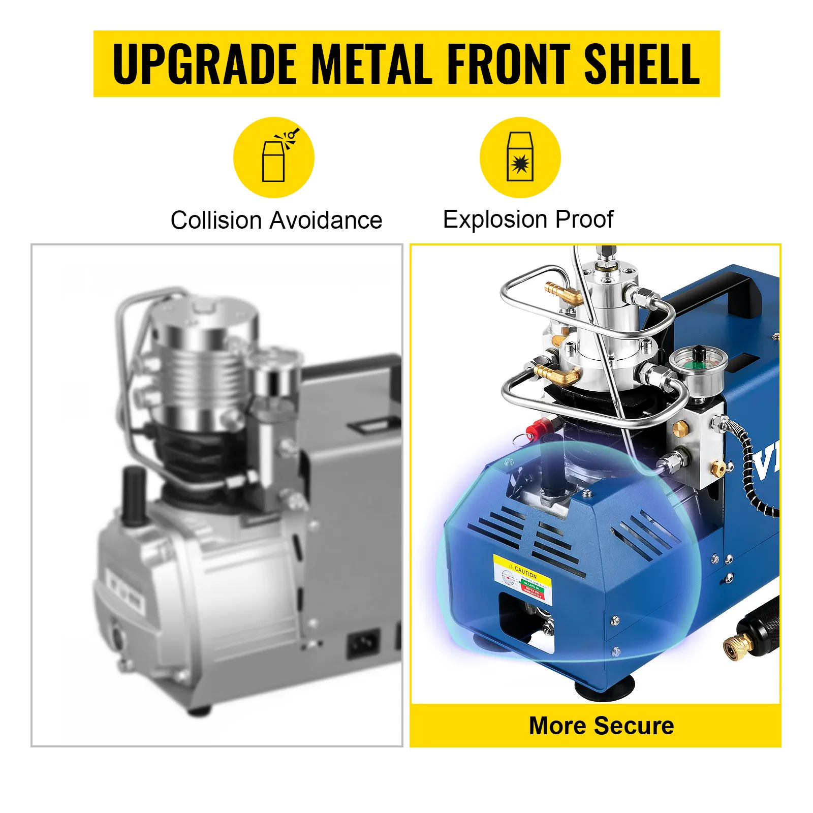 This scuba compressor is upgraded with durable metal fences in front and beside the machine body. The machine also is equipped with an explosion-proof design, which provides your security in various aspects. Warning: Please replace the oil plug to the breathing valve before starting the machine; otherwise, the device will explode.