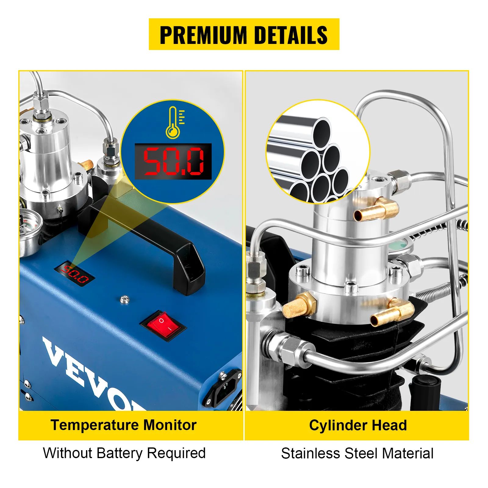 The pump is a 1800W PCP compressor with two-stage compression. With an automatic stop function, you can preset the pressure you need before the machine starts, and the maximum working pressure is 4500PSI. The compressor adopts an oil/water separator filtrating and water cooling system, ensures a stable performance and long service time. In addition, the compressor features an upgraded LED temperature display, explosion-proof valve, and stainless steel cylinder. Suitable for scuba tank, PCP air rifle, paintball tank, diving bottle, air pistol, etc.