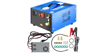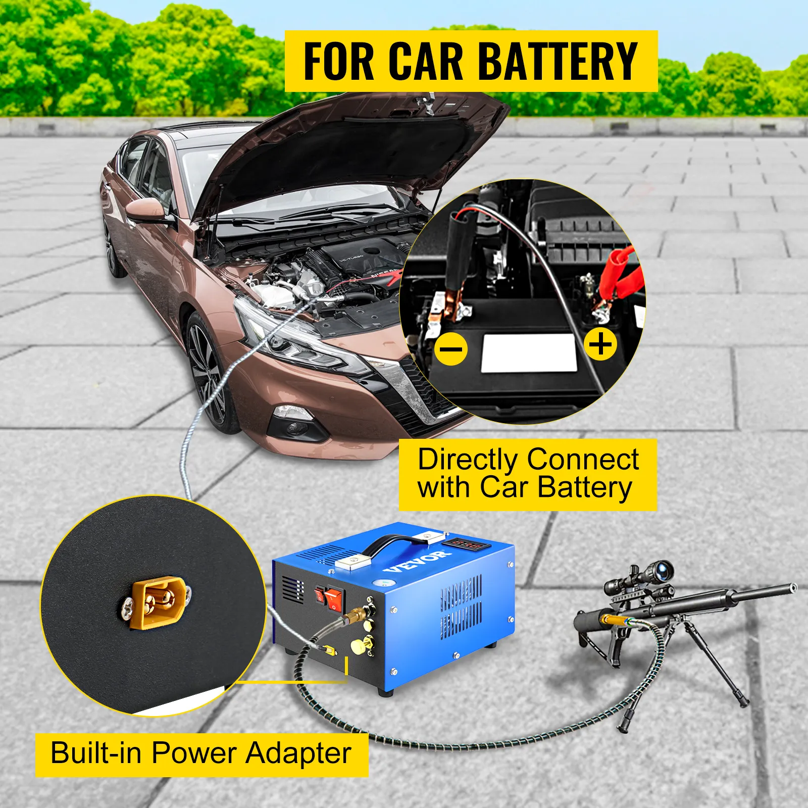 This PCP airgun compressor can be directly powered by a 12V car battery in the field. The maximum inflation tank is limited to 0.4 Gal/1.5 L. A 0.5 L tank will take 18 minutes from 0 to 300Bar and 5 minutes from 200 to 300Bar.
