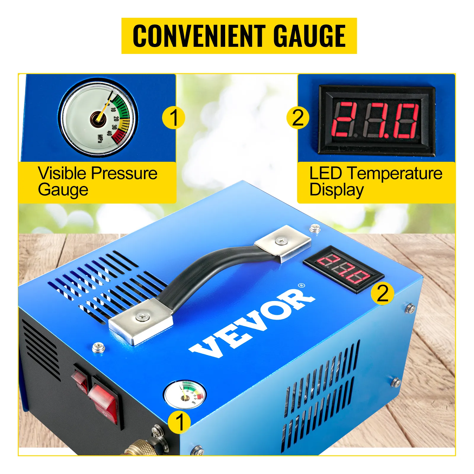 This portable PCP compressor has a visible pressure gauge and a LED temperature display. It is convenient for you to monitor the pump at any time. Please shut off the pump manually when the pressure reaches 4500Psi, or the temperature reaches 70 ℃.