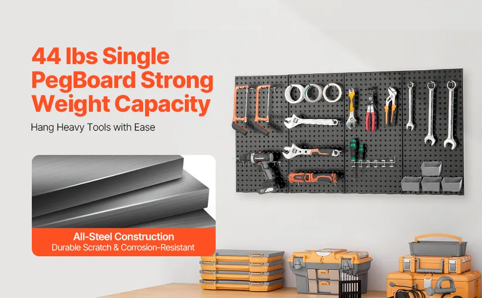 The metal peg board has ample space, allowing you to pair it with various hooks, brackets, and parts bins. Whether it's large tools or small parts, you'll easily find the ideal spot for everything.
