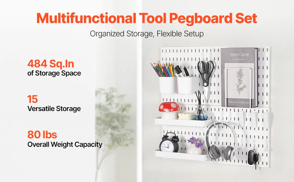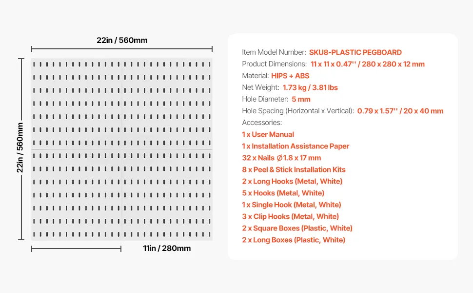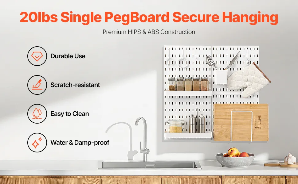 Made from high-quality HIPS material, this peg board organizer provides a robust weight capacity of up to 20 lbs per panel, ensuring excellent stability.