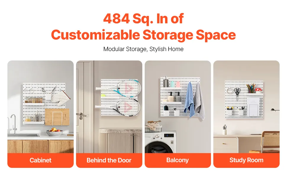 This pegboard combination kit is ideally suited for living rooms, bedrooms, kitchens, or office spaces. With a variety of storage accessories, it not only makes organization effortless but also adds a touch of style to your home environment.