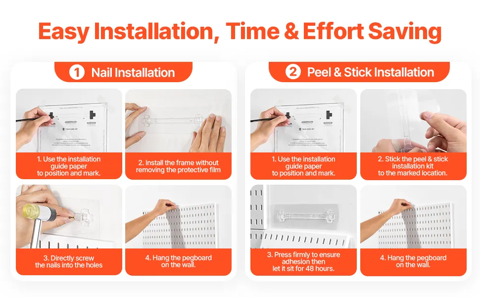 • Easy Installation: Multiple installation options are available. Whether you choose to nail the wall pegboard directly to the wall or use adhesive mounting, the included guide makes installation quick and hassle-free.