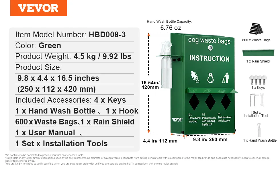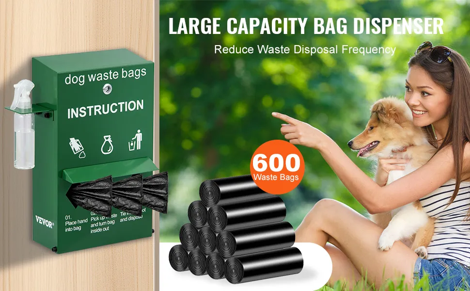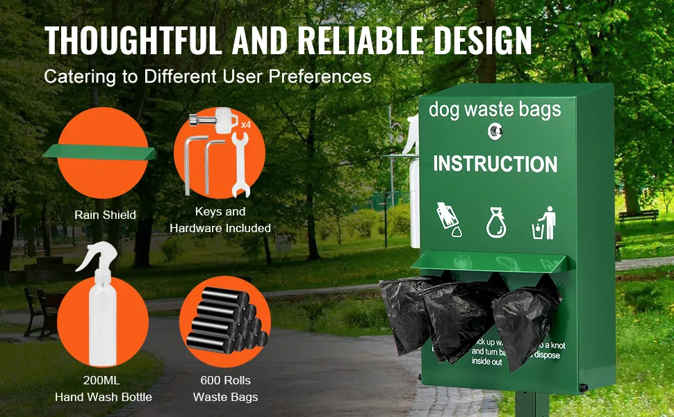 VEVOR Dog Poop Bag Dispenser with Hand Wash Bottle, Lockable Outdoor Dog Waste Bag Holder with 600 Waste Bags, Stake, Pole, Fence & Wall Mounted Dog Poop Bag Storage, Pet Waste Station for Porch, Lawn