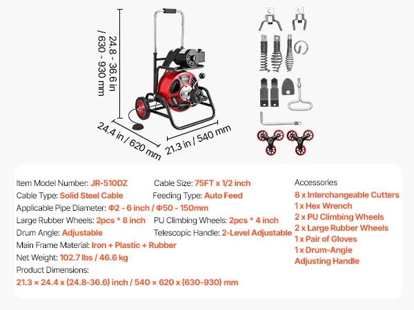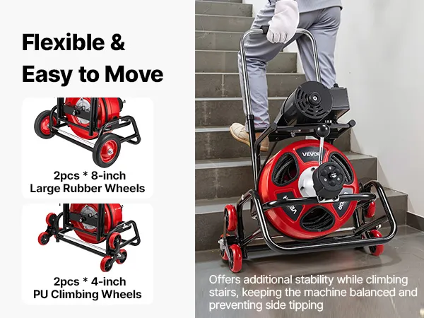 Enhanced Mobility & Stability: Our electric drain auger features two 8-inch (203 mm) rubber wheels for smooth movement and two 4-inch (102 mm) PU climbing wheels that provide extra stability when climbing stairs, keeping the sewer machine balanced and preventing side tipping