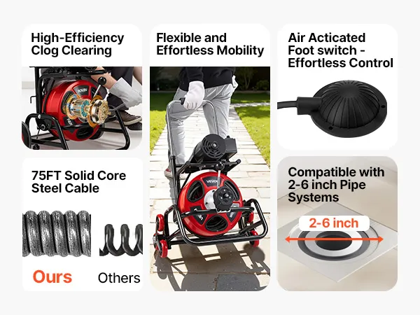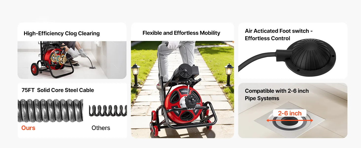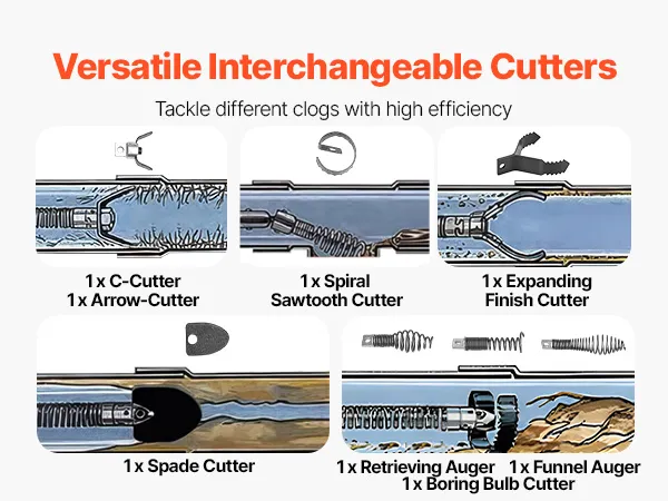 Easy Operation & Versatile Cutters: Enhanced with CW/CCW control and an air-activated foot switch, cable management is effortless. Paired with the 8 interchangeable cutters, the sewer auger handles various clogs in drain pipes, sinks, sewers, toilets, etc