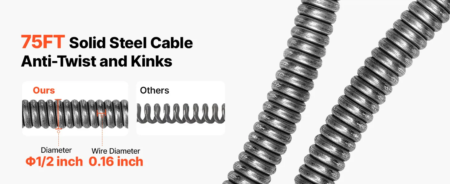 Premium Steel Core Cable: Our 22m x 12.7mm solid core steel cable resists breakage, twisting, kinking, and corrosion for easy navigation through complex curved pipes. Ideal for 50mm to 150mm pipes, it ensures a smoother and more efficient clogs clearing process