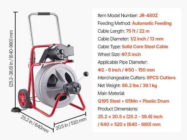 Are you tired of clogged drainage pipes, expensive plumbing services, and incomplete unclogging? Say bye to unpleasant smells and troublesome maintenance! Let the VEVOR electric drain cleaning machine with 22m x 13mm solid core steel cable deliver fast, efficient pipe blockage clearing.