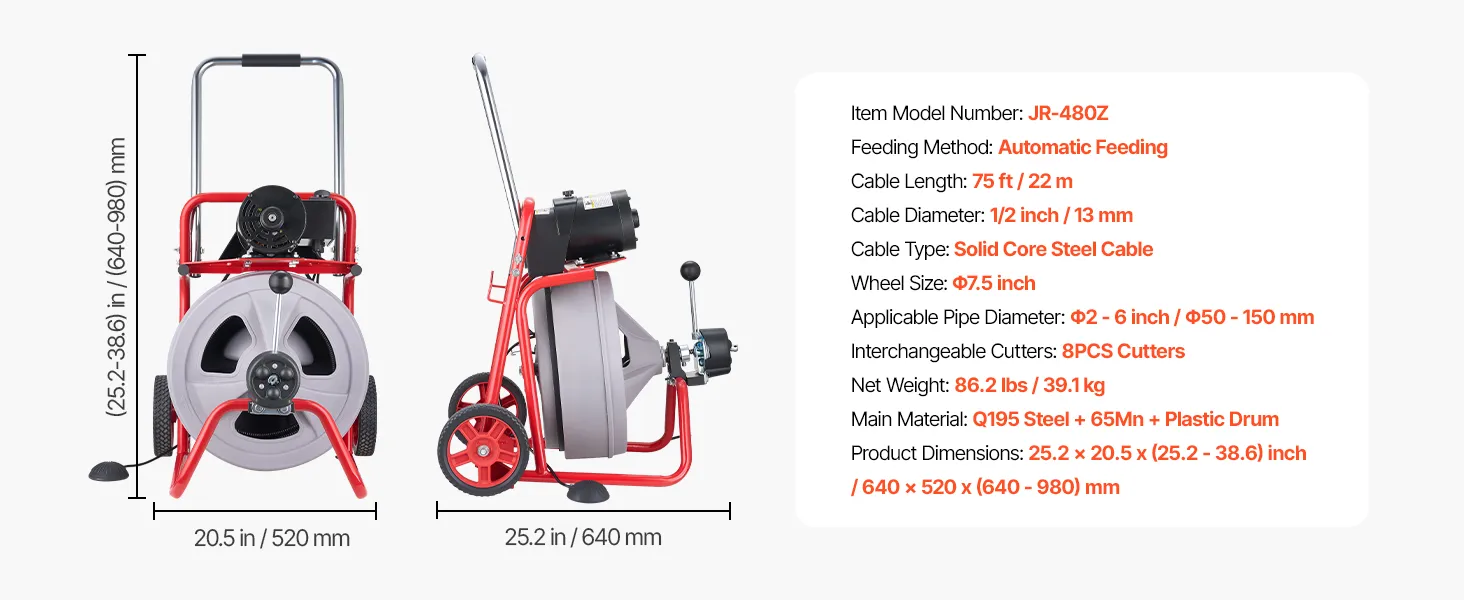 Movable and Space-Saving: Take it anywhere, store it with ease! This drain cleaning machine is equipped with large wheels for effortless movement. And the telescopic handle provides more ergonomic use and makes transport and storage easier